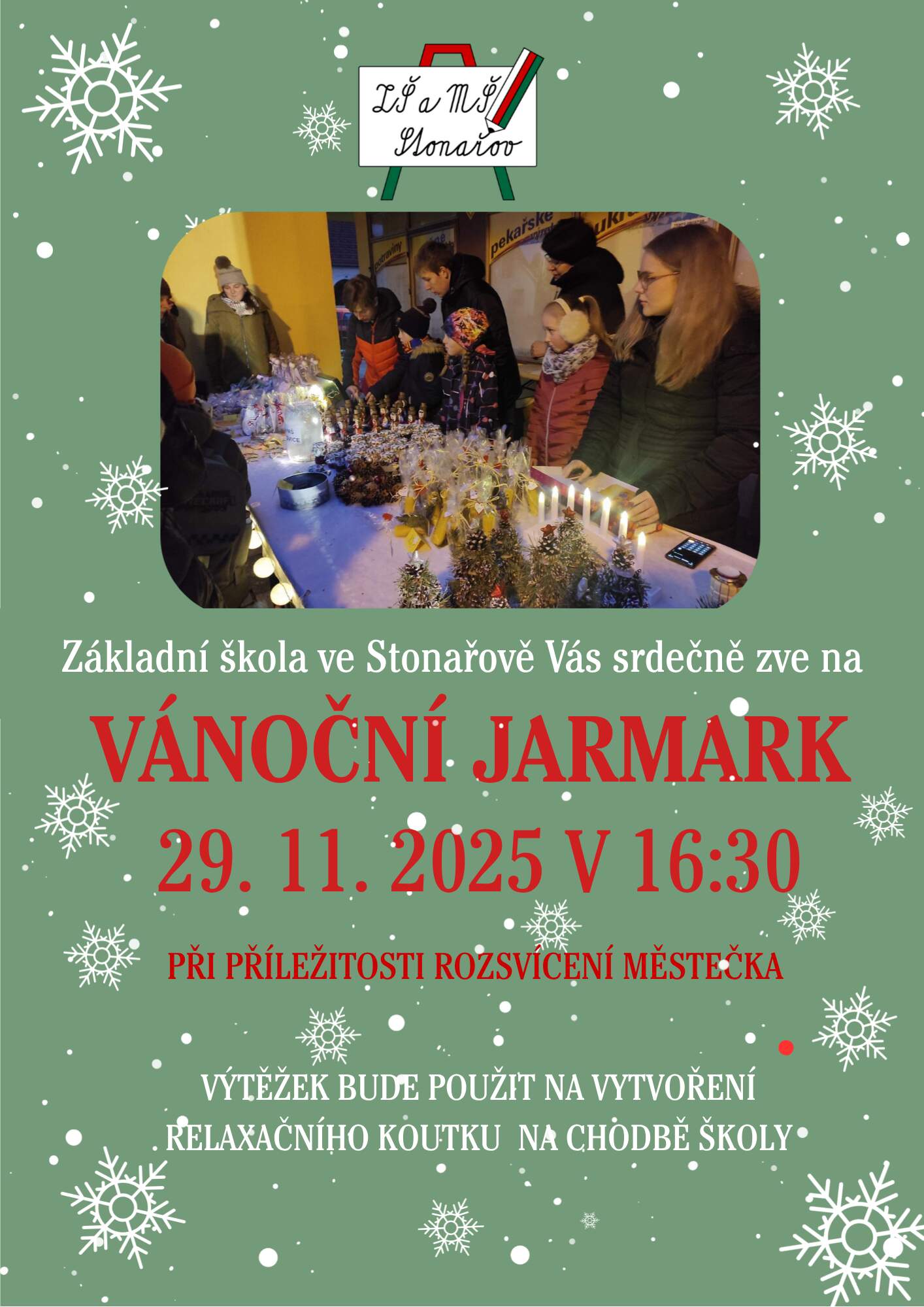 Při příležitosti rozsvícení městečka připravují žáci základní školy vánoční jarmark. Výtěžek z jarmarku bude použit na vytvoření relaxačního koutku pro děti na chodbě školy.