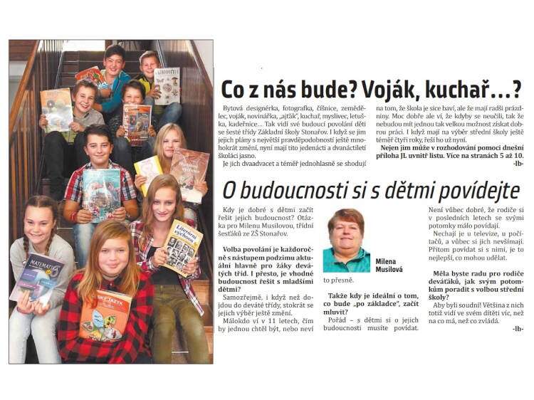 Žáci 6. ročníku absolvovali začátkem listopadu exkurzi v našich regionálních novinách. Dozvěděli se mnoho zajímavého o tvorbě novin, jedním z diskusních témat byla i jejich profesní budoucnost. Kromě zážitků si žáci odnesli i nesmazatelný otisk na titulní straně.